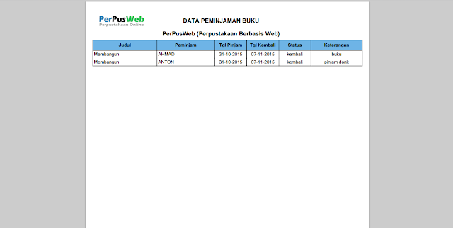 - FPDF untuk membuat laporan PerPusWeb menggunakan plugin FPDF sehingga report yang di hasilkan bisa di cetak maupun di simpan soft copynya.